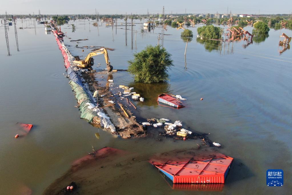 8月5日,搶險人員在潰口處進(jìn)行作業(yè)(無(wú)人機照片)。新華社記者 潘昱龍 攝