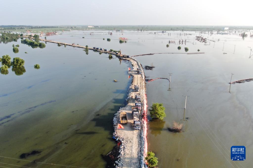 8月5日,搶險人員運送物料前往繞陽(yáng)河潰口處(無(wú)人機照片)。