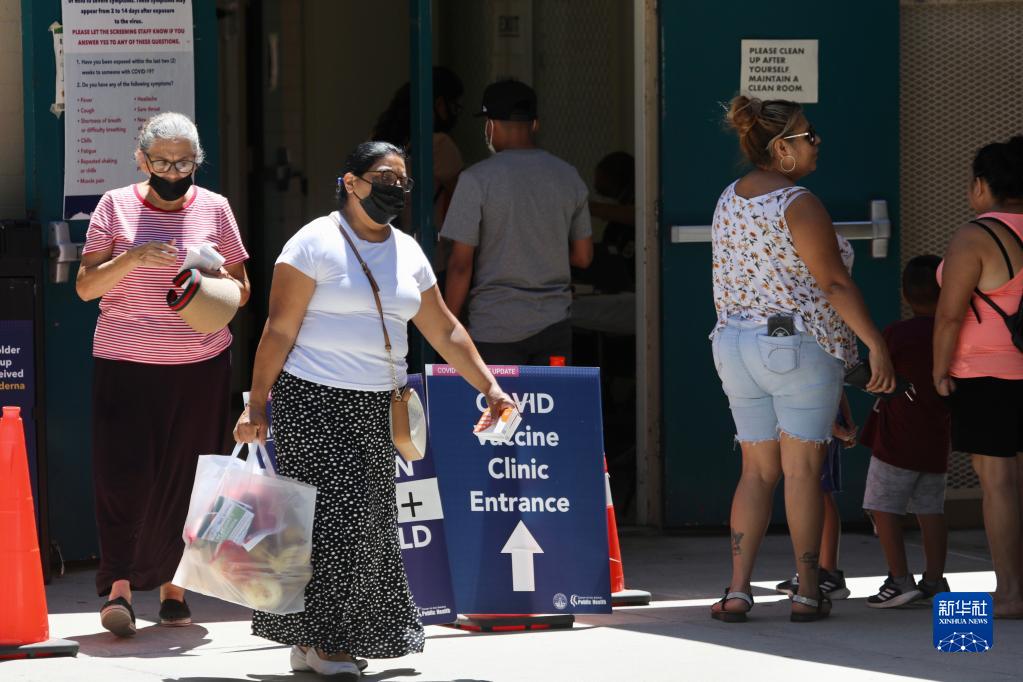 8月5日,在美國加利福尼亞州洛杉磯縣,戴著(zhù)口罩的當地居民等待接種新冠疫苗。