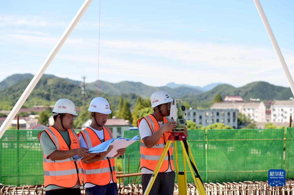 8月6日,測量人員在中鐵十一局池黃鐵路墩上特大橋系桿拱施工現場(chǎng)對拱體進(jìn)行數據監測。