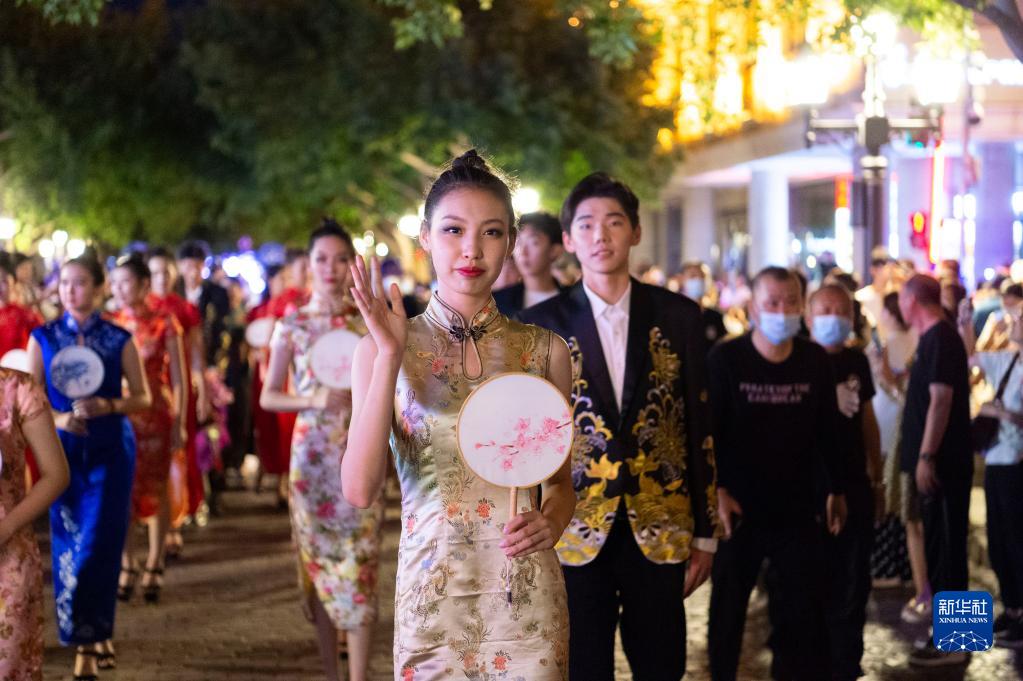 8月5日,模特在哈爾濱市中央大街巡游。