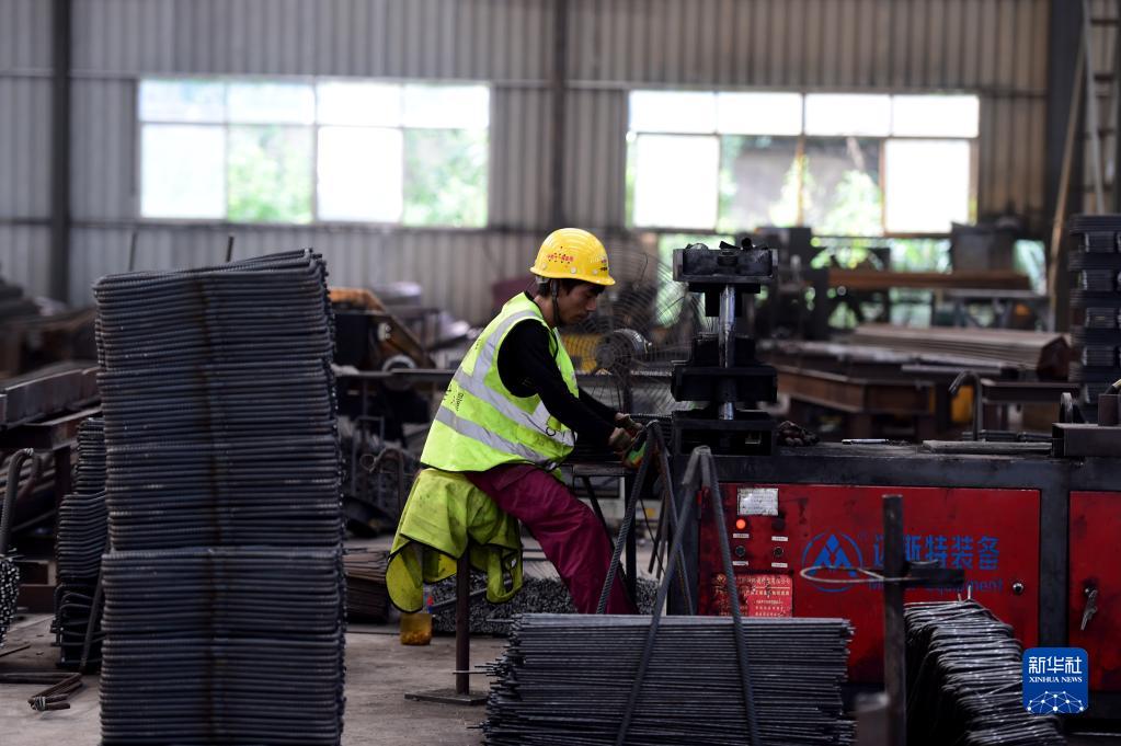 8月6日,工人在中鐵十一局池黃鐵路站前一標項目鋼構件加工廠(chǎng)加工鋼筋。