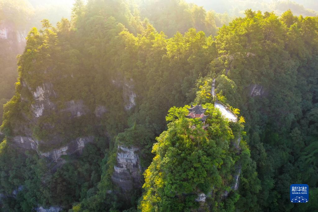8月7日,朝陽(yáng)照在云臺山山林間(無(wú)人機照片)。