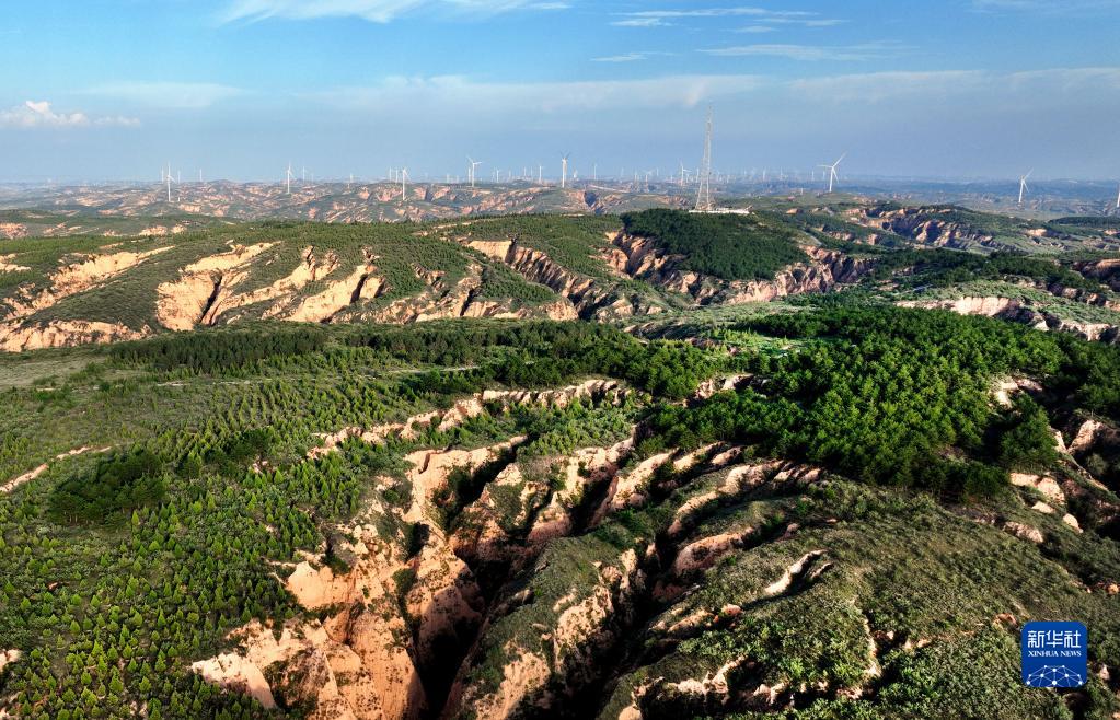 俯瞰神木市馬場(chǎng)梁臥虎寨10萬(wàn)畝生態(tài)林基地(8月3日攝,無(wú)人機照片)。該基地南北長(cháng)54公里,東西寬1至3公里,栽植樹(shù)種主要為側柏、油松、樟子松,是神木質(zhì)量最高、效益最好的生態(tài)林基地,林木保存率高達95%以上。
