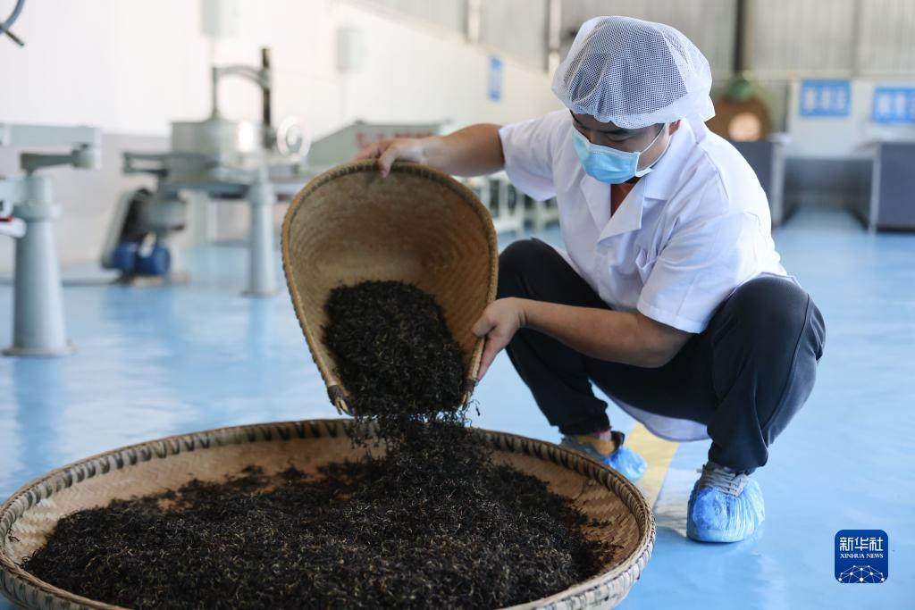 8月9日,工作人員在石阡縣楓香鄉梨子園村茶葉加工廠(chǎng)內對茶葉進(jìn)行復烘。