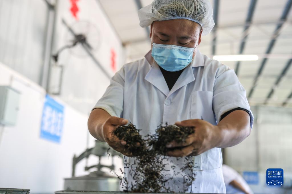 8月9日,工作人員在石阡縣楓香鄉梨子園村茶葉加工廠(chǎng)內對茶葉進(jìn)行烘干。