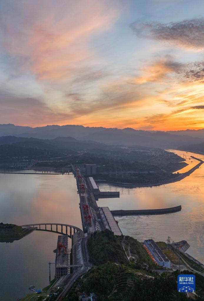日出時(shí)分,在湖北省宜昌市秭歸縣,朝霞把長(cháng)江三峽大壩裝扮得美不勝收(8月9日,無(wú)人機照片)。