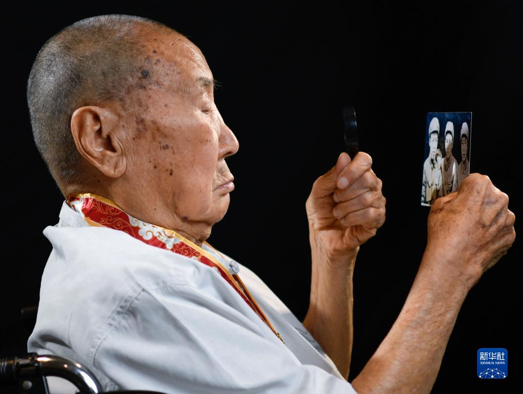 6月13日,在四川省南充市,抗戰老戰士王增印觀(guān)看年輕時(shí)與戰友們的合照。