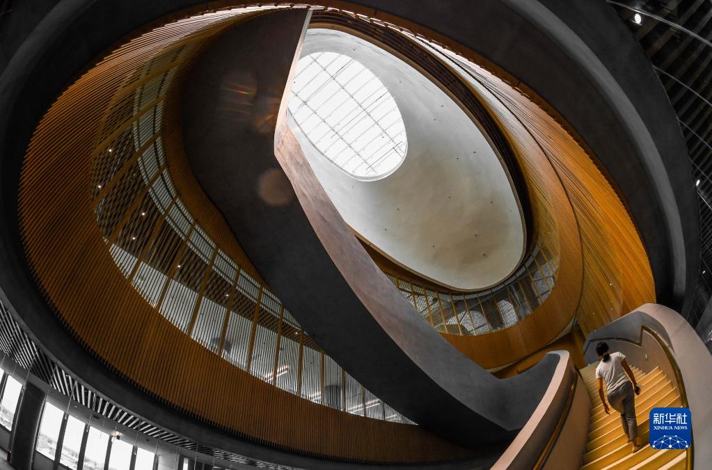 一名工作人員行走在香港科技大學(xué)(廣州)圖書(shū)館的樓梯上(8月16日攝)。