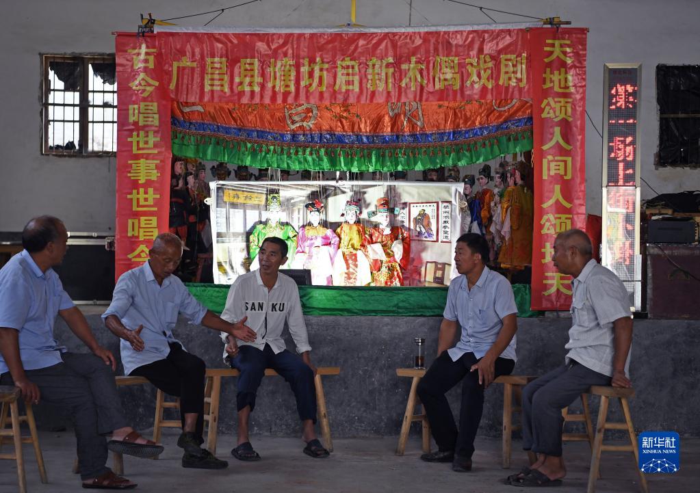 在江西省廣昌縣塘坊鎮淇田村,木偶劇團成員在一起討論演出劇本(8月10日攝)。