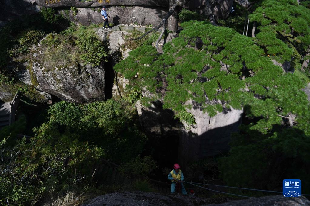 8月15日,李培生(下)在黃山風(fēng)景區的懸崖峭壁間清撿垃圾,胡曉春(上)在迎客松附近巡查。