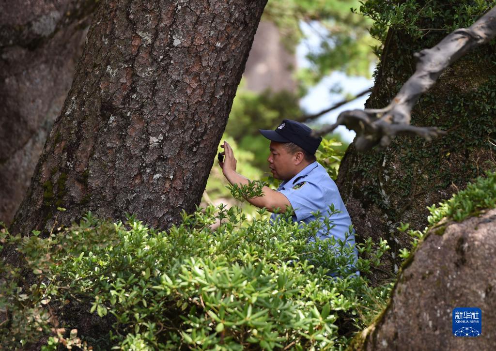 8月14日,胡曉春用放大鏡檢查迎客松的樹(shù)皮和紋理,以便及時(shí)發(fā)現病蟲(chóng)害。