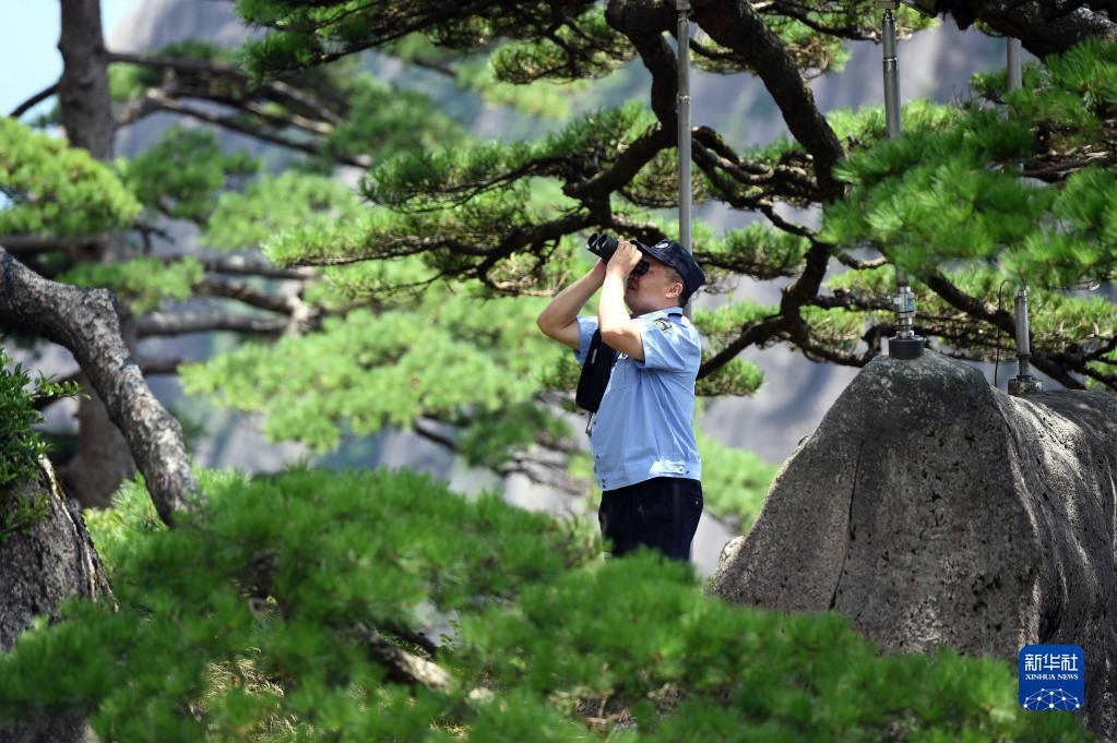 8月14日,胡曉春在例行巡查中用望遠鏡查看迎客松情況。