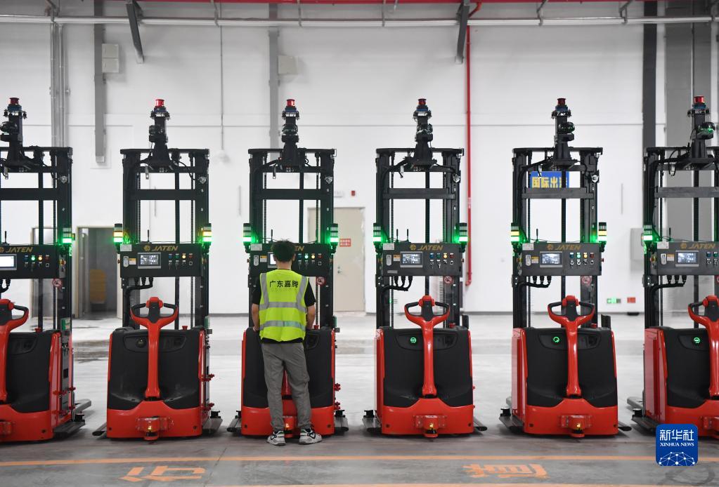 8月16日,在鄭州機場(chǎng)北貨運區倉庫,工作人員在調試自動(dòng)化導引叉車(chē)。