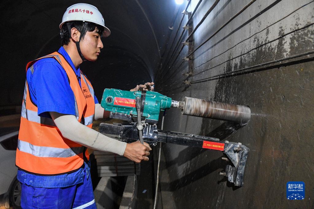 8月16日,在位于廣西環(huán)江毛南族自治縣的貴南高鐵九萬(wàn)大山四號隧道內,技術(shù)人員進(jìn)行取芯作業(yè)。