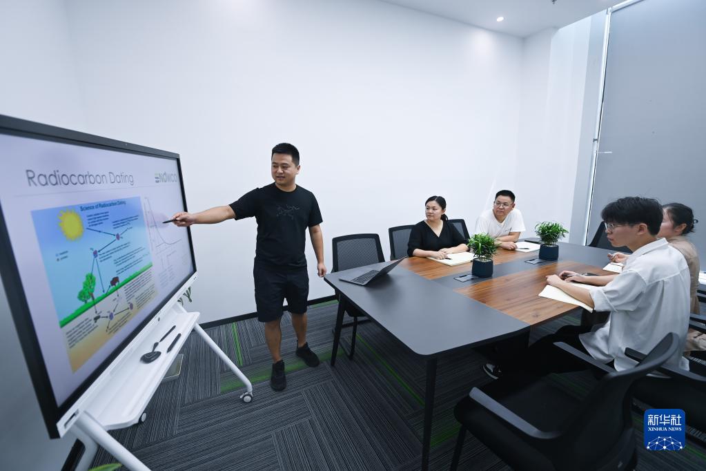 8月17日,在天目醫藥港醫藥產(chǎn)業(yè)孵化園的一家生物科技有限公司內,杭州市引進(jìn)人才陳朗(左一)和他的團隊在會(huì )議室交流。