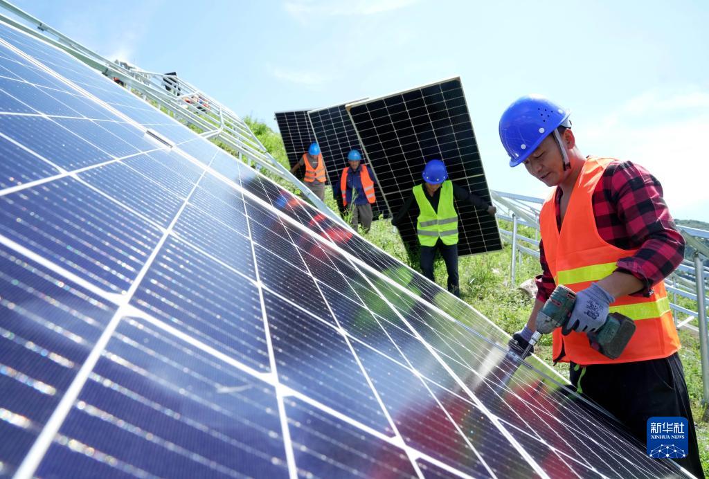 8月17日,在河北省秦皇島市青龍滿(mǎn)族自治縣草碾鄉華山村附近的荒山上,工人在150兆瓦光伏發(fā)電站建設工地施工。