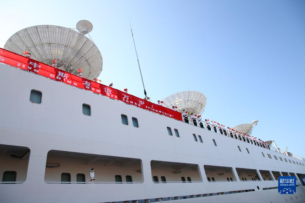 8月16日,在斯里蘭卡南部漢班托塔港,中國遠望5號船上掛出“中斯友誼萬(wàn)歲”字樣的橫幅。