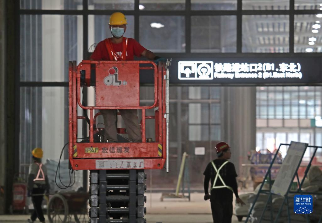 8月17日,工人在廣西南寧國際空港綜合交通樞紐工程施工現場(chǎng)進(jìn)行裝飾作業(yè)。