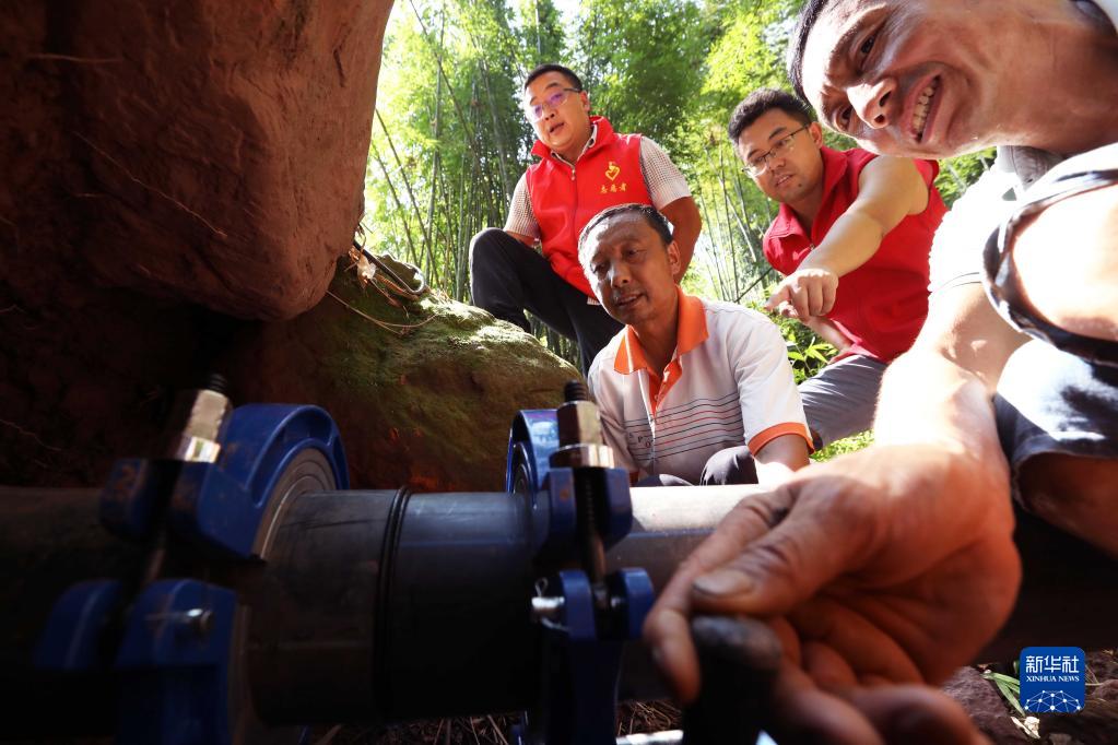 8月18日,在貴州省赤水市寶源鄉玉豐村,黨員干部群眾在鋪設應急供水管道。