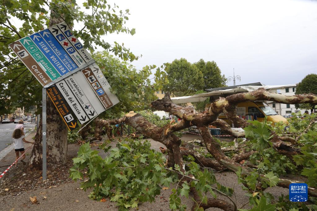 這是8月18日在意大利托斯卡納大區首府佛羅倫薩拍攝的被刮倒的樹(shù)木和路牌。
