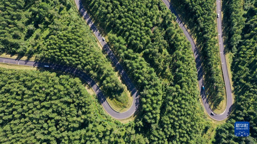8月20日,車(chē)輛在塞罕壩國家森林公園的道路上行駛(無(wú)人機照片)。