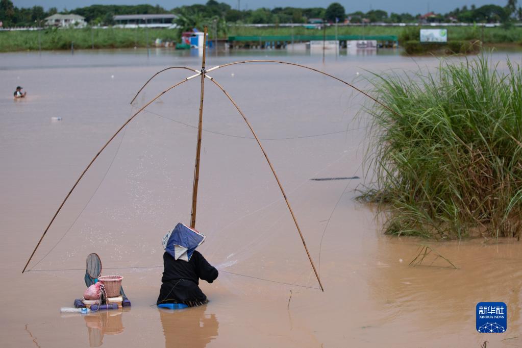 8月20日,在老撾萬(wàn)象,漁民在漲水的湄公河上捕魚(yú)。