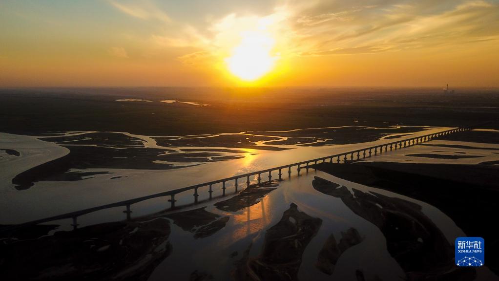 8月16日在內蒙古鄂爾多斯市杭錦旗拍攝的黃河日落景觀(guān)(無(wú)人機照片)。