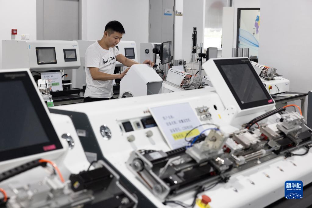 在臨港新片區生命科技產(chǎn)業(yè)園一處醫療設備生產(chǎn)車(chē)間,工人在調試醫療設備(8月18日攝)。