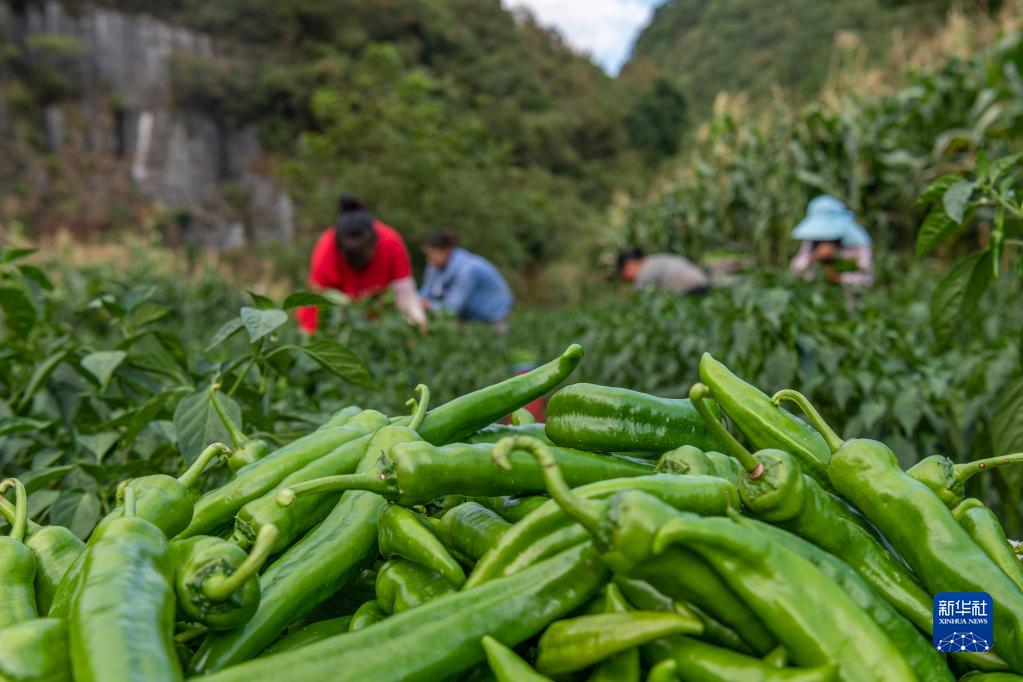 8月22日,在貴州省畢節市百里杜鵑管理區百納鄉龍坪村,村民在采收辣椒。