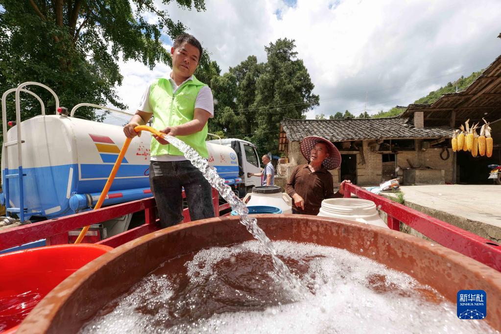 8月23日,在貴州省黔東南苗族侗族自治州岑鞏縣客樓鎮豐壩村,黨員志愿者為群眾送水。