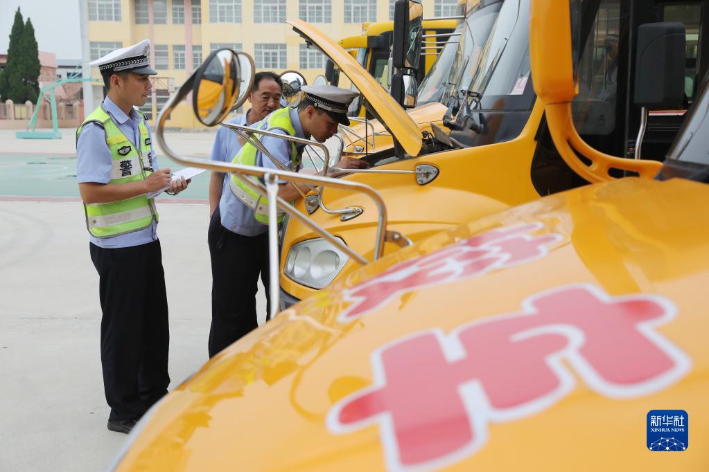 新學(xué)期開(kāi)學(xué)在即,安徽省淮北市開(kāi)展校車(chē)安全專(zhuān)項大檢查,組織交警和相關(guān)技術(shù)人員對轄區校車(chē)信息資料、校車(chē)司機駕駛資格、校車(chē)安全性能、防疫措施和隨車(chē)配備的安全應急器材設備等逐一檢查,消除校車(chē)安全隱患,確保學(xué)生乘車(chē)安全。