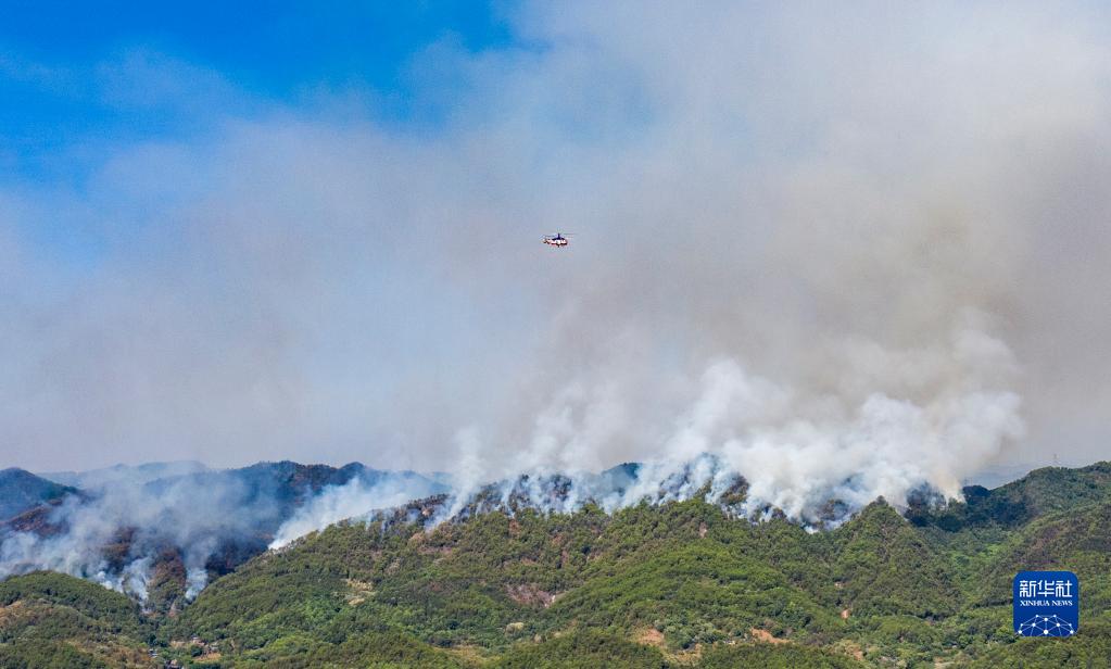 8月22日,在重慶市巴南區界石鎮,一架救援直升機在勘察火場(chǎng)情況(無(wú)人機照片)。