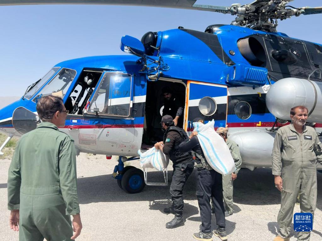 8月28日,在巴基斯坦俾路支省賈法拉巴德地區,人們從直升機上卸下救災物資。
