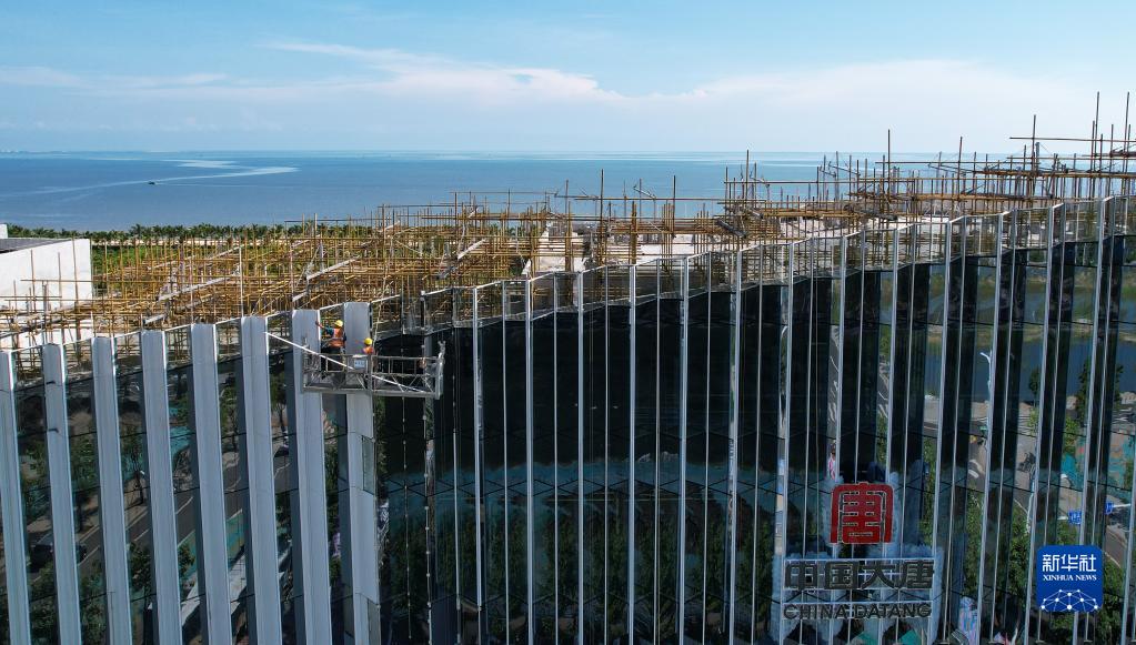 9月1日,工人在??诮瓥|新區的大唐國際貿易中心項目施工作業(yè)(無(wú)人機照片)。