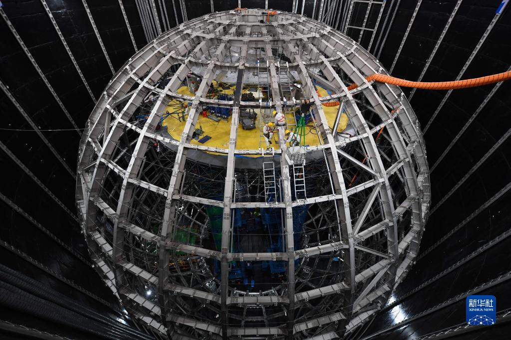 這是9月2日拍攝的位于地下700米的江門(mén)中微子實(shí)驗探測器,呈現出巨大的球形結構。新華社記者 鄧華 攝