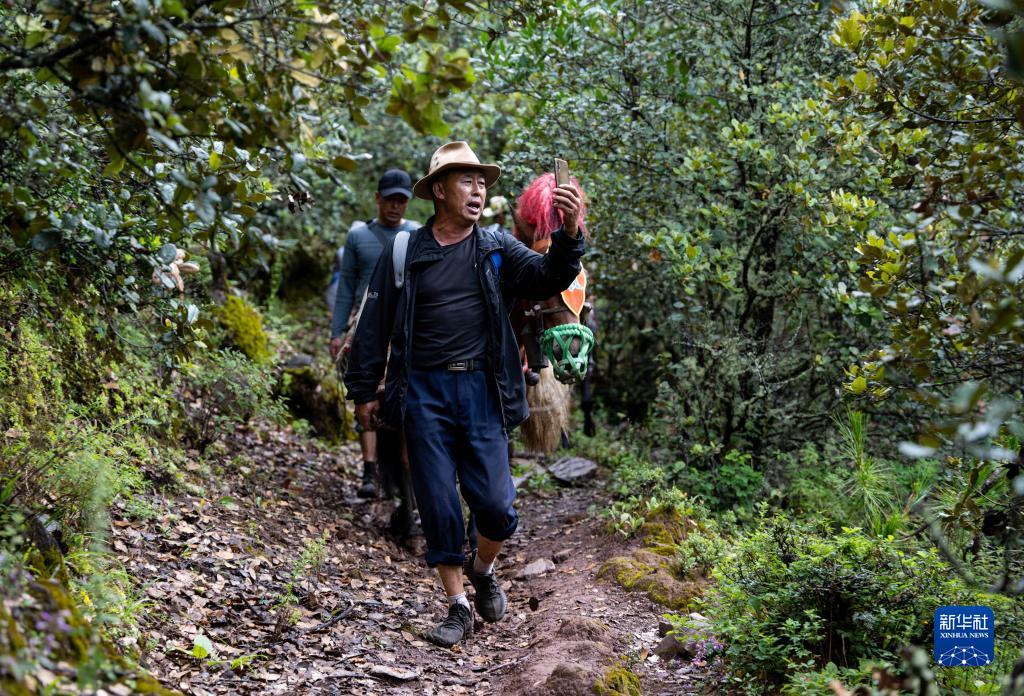 瀘沽湖馬幫隊隊長(cháng)楊直之一邊牽著(zhù)馬一邊唱著(zhù)山歌錄視頻(9月1日攝)。