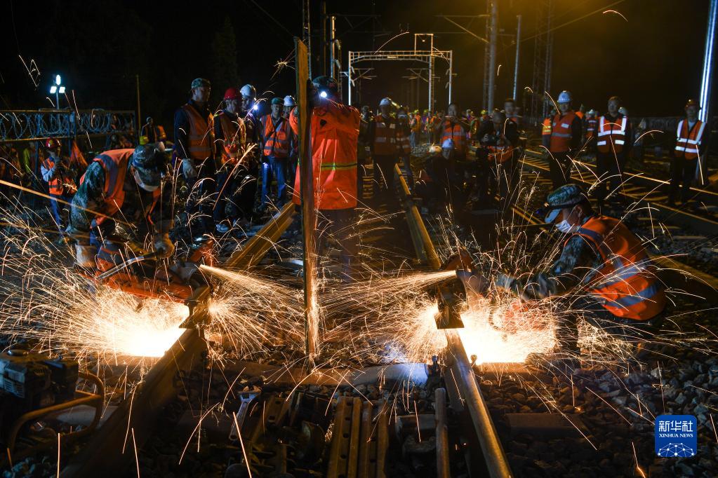 9月2日晚,工人在渝利鐵路沙子站增設客運設施項目作業(yè)。