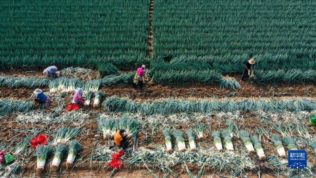 9月5日,農民在河北省玉田縣亮甲店鎮十五里鋪村田間收獲大蔥(無(wú)人機照片)。