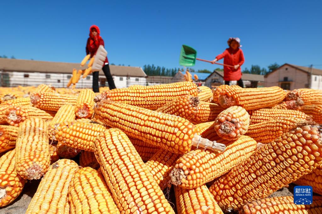9月5日,河北省唐山市豐南區唐坊鎮擋水埝村農民在曬場(chǎng)晾曬玉米。