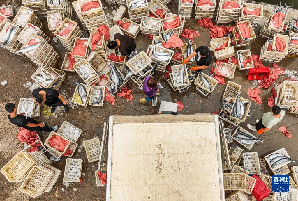 9月5日,在山東省榮成市石島漁港碼頭,漁民們分揀、裝運各類(lèi)漁獲(無(wú)人機照片)。