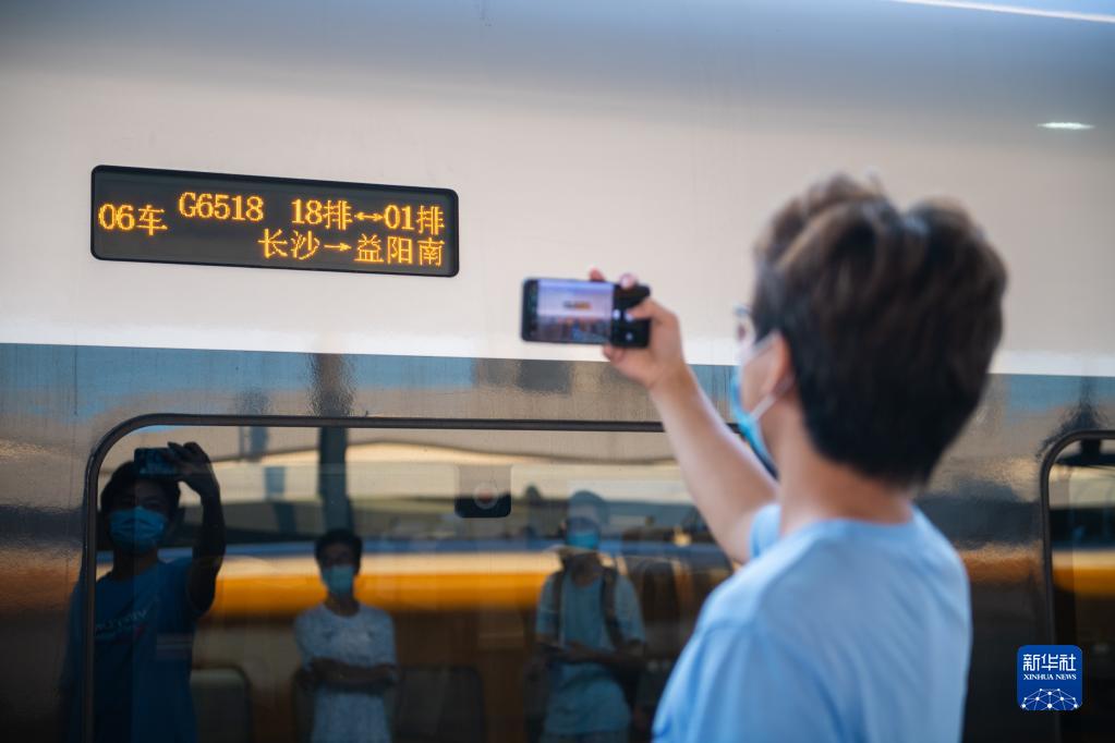 9月6日,在長(cháng)沙火車(chē)站站臺,搭乘渝廈高鐵益長(cháng)段長(cháng)沙首發(fā)G6518次列車(chē)的旅客在拍攝列車(chē)外觀(guān)。