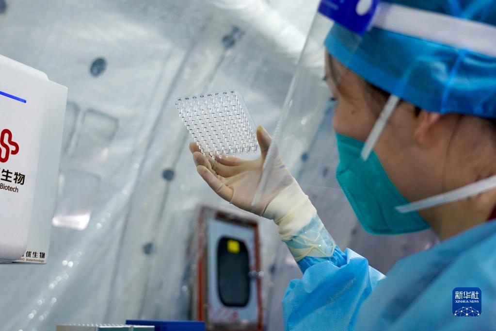 9月5日,核酸檢測隊工作人員在氣膜方艙實(shí)驗室內作業(yè)。