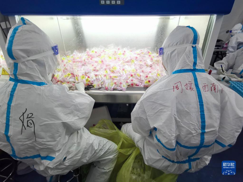 9月4日,核酸檢測隊工作人員在氣膜方艙實(shí)驗室的生物安全柜前對收樣的標本進(jìn)行處理。