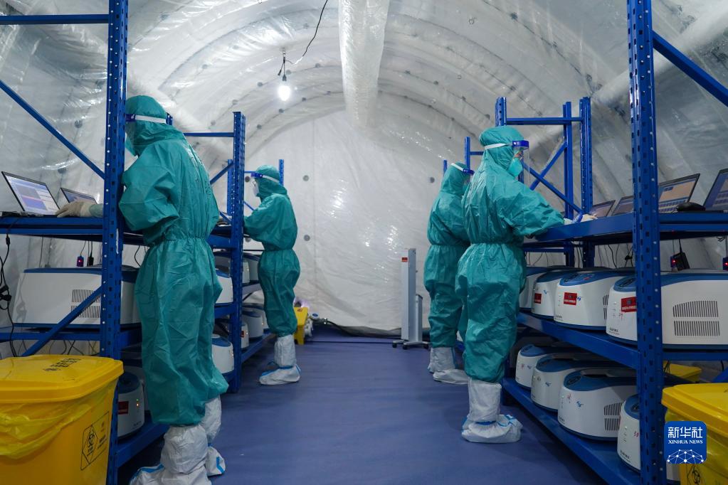 9月5日,核酸檢測隊工作人員在氣膜方艙實(shí)驗室擴增分析區作業(yè)。