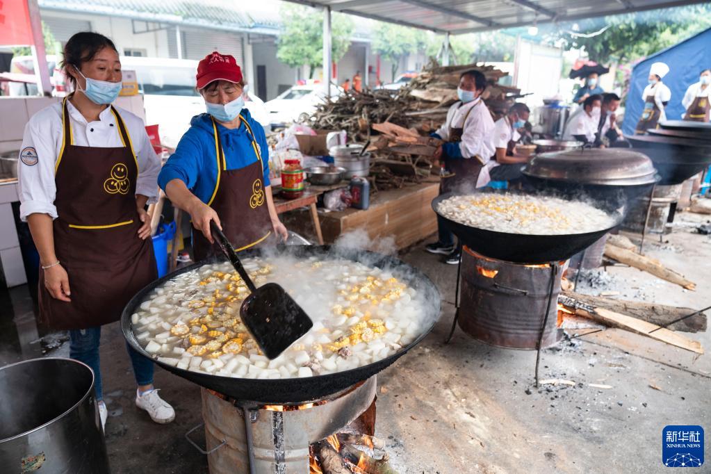 9月9日,在石棉縣新民鄉海耳村臨時(shí)安置點(diǎn),村民志愿者在做飯。