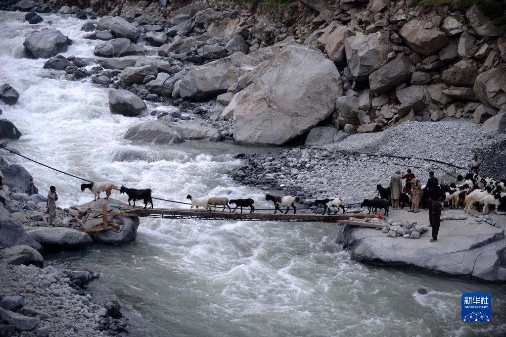 9月1日,在巴基斯坦開(kāi)伯爾-普什圖省斯瓦特地區,人們驅趕牲畜從洪水過(guò)后臨時(shí)搭建的小橋上跨過(guò)湍急的山澗溪流。
