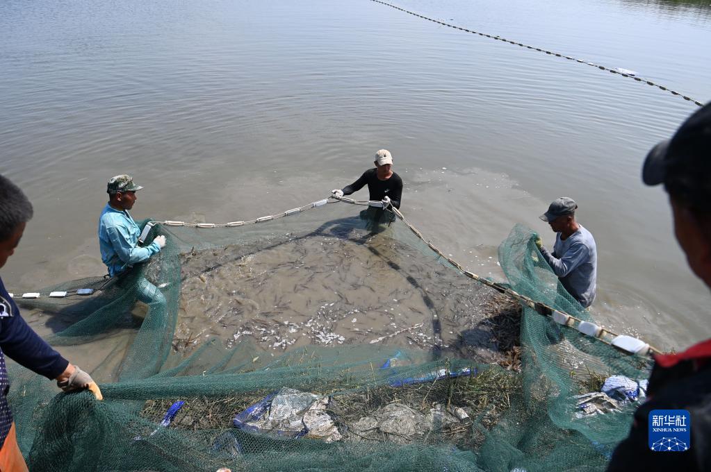 天津市濱海新區北塘街村民在蝦塘拉網(wǎng)捕蝦(9月9日攝)。