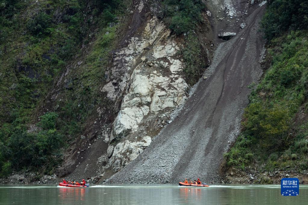 9月6日,救援人員乘坐橡皮艇經(jīng)水路,再爬山路進(jìn)入四川省甘孜州瀘定縣得妥鎮灣東村。