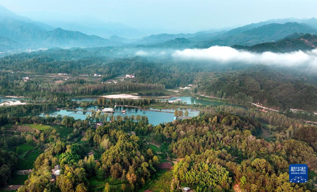 9月12日拍攝的云霧繚繞的西鄉縣峽口鎮山林與茶園(無(wú)人機照片)。